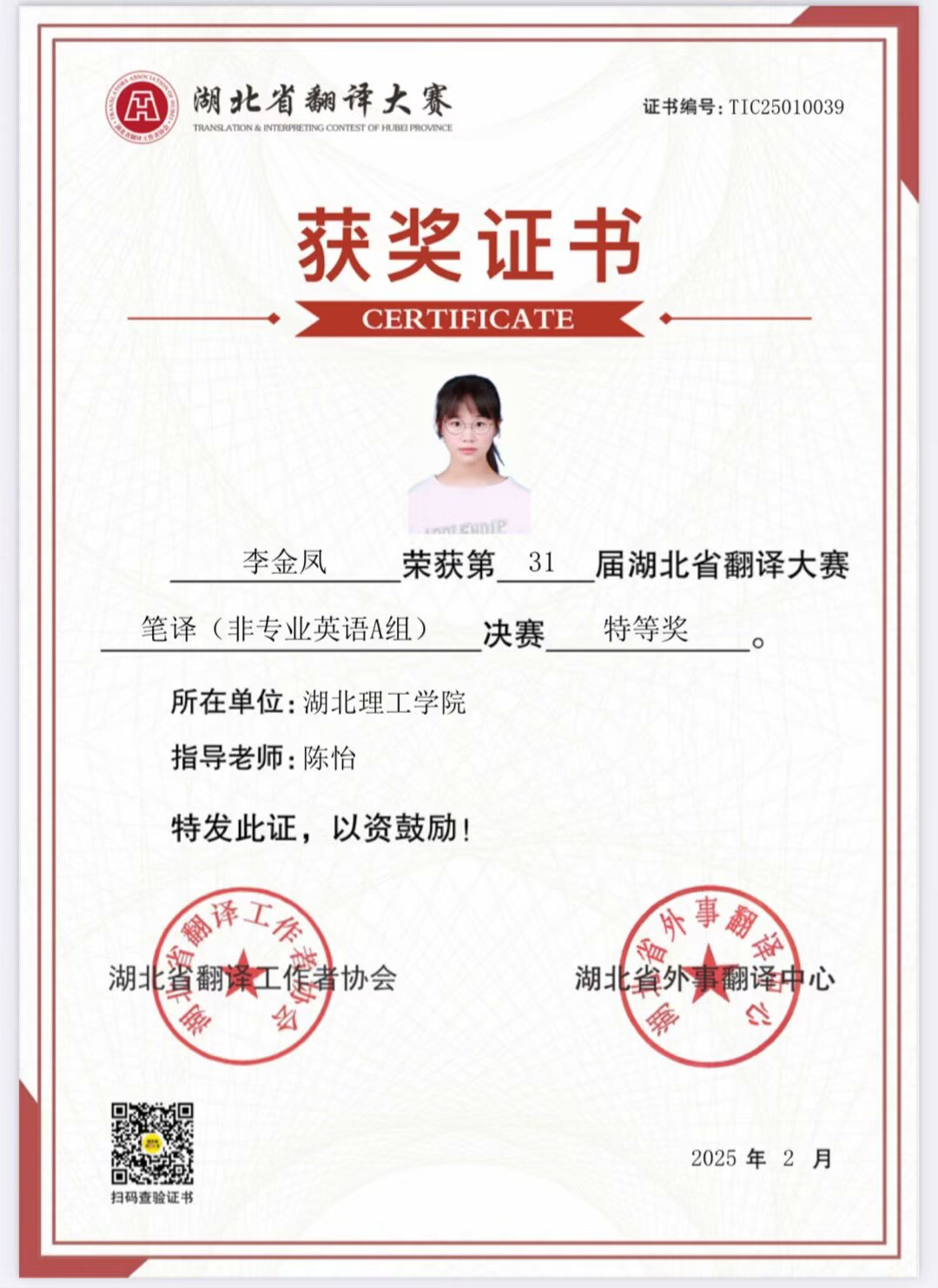 本网消息 近日,第三十一届湖北省翻译大赛圆满落幕,我校william威廉中文国际经济与贸易专业2024级学生李金凤凭借卓越的综合素养与稳定的现场发挥,斩获非英语专业组特等奖,展现了学科交叉培养的成效。