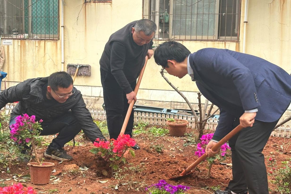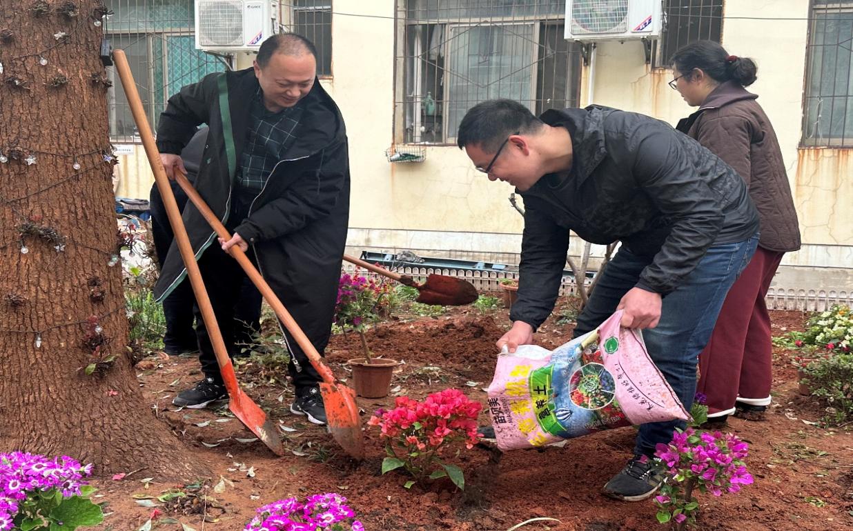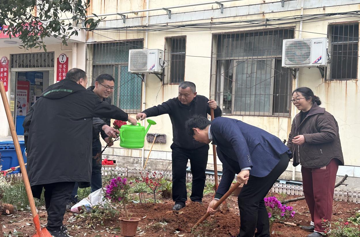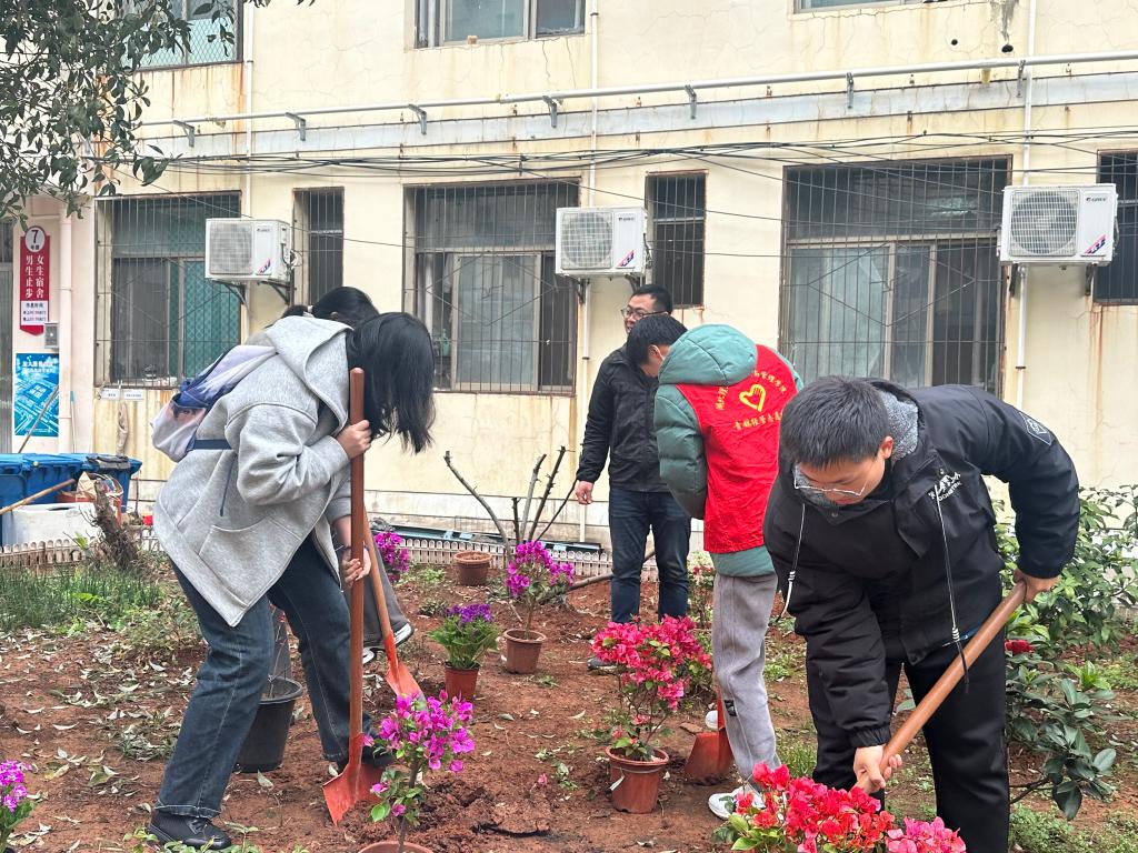 活动现场,师生们热情洋溢、干劲十足。大家分工明确,默契配合,有的奋力挥动铁锹铲土挖坑,有的小心翼翼地扶正树苗,有的则提水浇灌,每一个步骤都有条不紊地进行着。师生们齐心协力,让一棵棵树苗、一丛丛花卉稳稳扎根在土壤中。