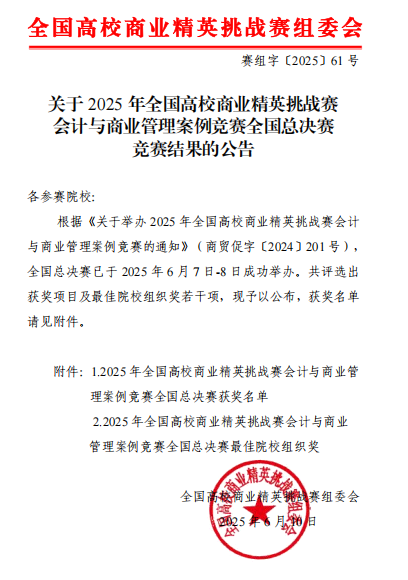 本网消息 近日,2025年全国高校商业精英挑战赛会计与商业管理案例竞赛全国总决赛圆满落幕。经过激烈角逐,我院财务管理专业派出的两支参赛队伍凭借出色的团队协作和扎实的专业能力,在彭秋琼和涂红星老师的精心指导下脱颖而出,斩获两项全国二等奖。