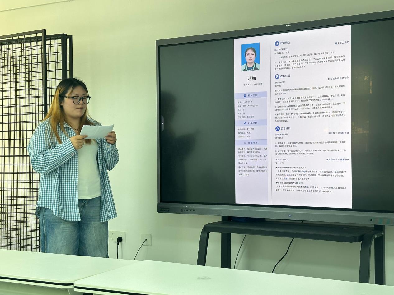 自比赛启动,经管学院的同学们认真打磨每一份简历,巧妙融入自身专业技能、实践经历、独特优势以及明晰的职业规划,力求在众多参赛作品中崭露头角。比赛现场,参与院赛的选手们通过精心制作的个人简历展示自己丰富的实践经历、出色的专业技能以及自身优势,并围绕简历和自我展示PPT进行阐述。