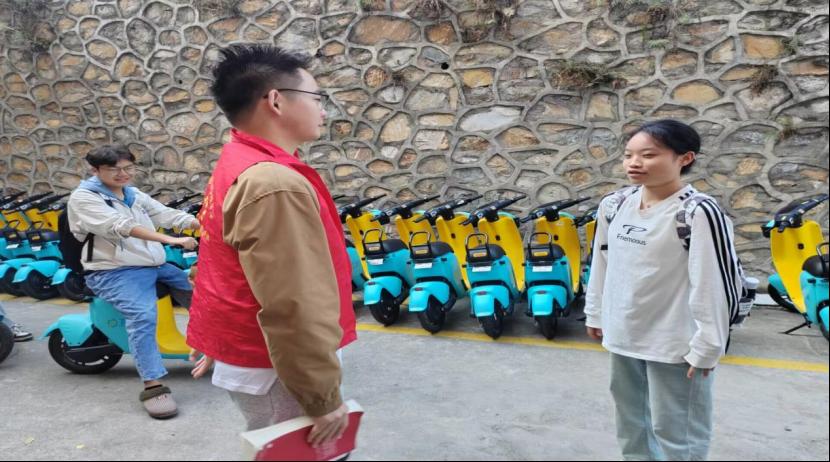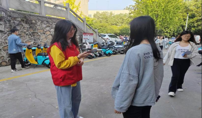志愿者们首先以X3教学楼为中心向同学们宣传了安全骑行知识,例如安全佩戴头盔、靠右行驶,礼让行人、减速慢行等,然后为学生示范了如何在骑行前安全检查车辆是否符合骑行的标准,最后询问了解学生日常骑行中发现的安全问题,积极记录并提出解决方案。