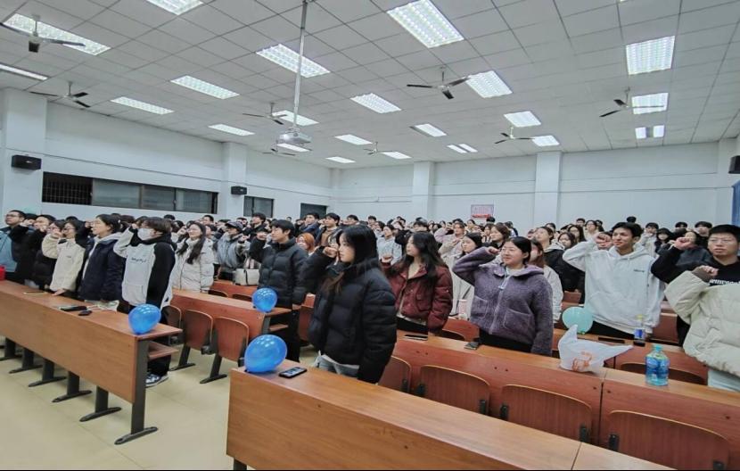 活动开始前,实践部的工作人员们就早早到达指定地点布置现场,整理此次活动的参与人员的名单并组织进行签到。随后活动正式开始,两位主持人开场介绍本次汇演的主要内容后,汪国超老师开场致词表达对全体同学的祝愿,并且在学生代表的带领下全体同学站起来一起庄严宣誓。