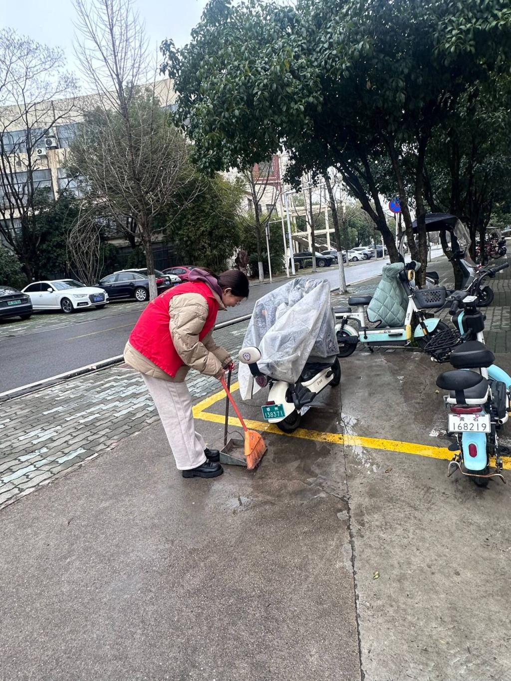 活动当天,志愿者们分工协作,各司其职,以X3教学楼为中心展开服务。志愿者手持铲刀、喷壶等工具清理墙面小广告,搬运楼道堆积杂物;在主干道两侧,他们捡拾绿化带垃圾,规范共享单车停放;在教室里,他们清理留下的垃圾,擦拭墙壁,一丝不苟,用拖把将教室拖得一尘不染。
